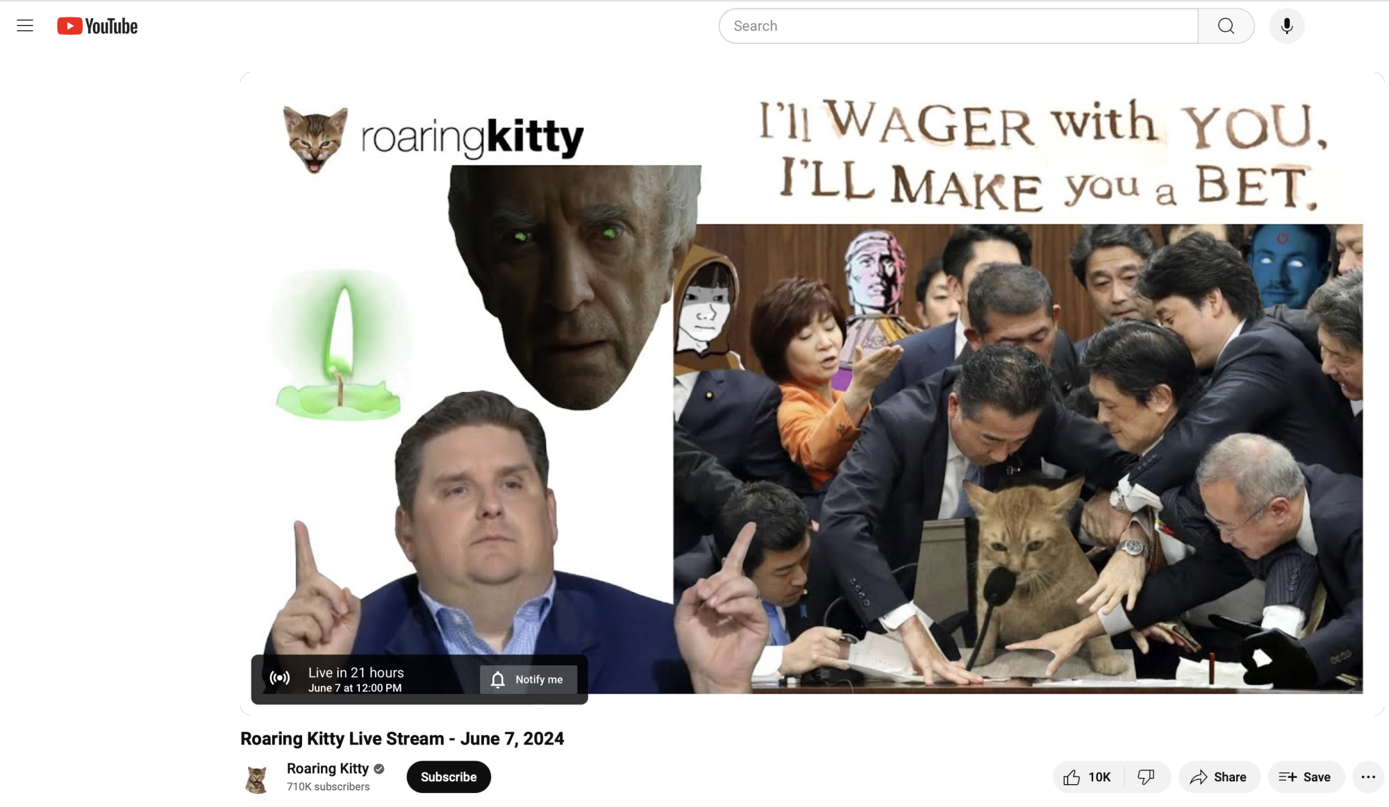 Roaring Kitty的YouTube直播页面。来源:YouTube发布几分钟后,超过10,000名YouTube用户表示有兴趣在直播开始时收到通知。视频的实时聊天室中有数百条评论。GameStop的股票代码GME迅速成为热门的StockTwits聊天室和Reddit的WallStreetBets论坛上的热门话题。