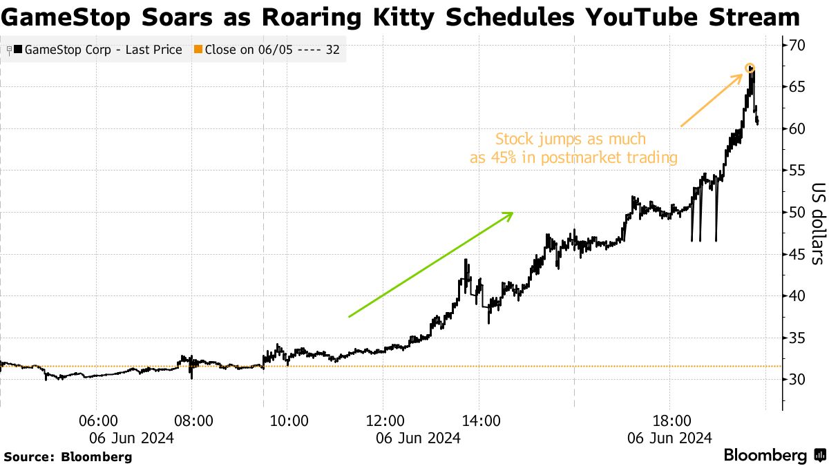 摄影师:何塞普·拉戈/法新社/盖蒂图片社基思·吉尔(Keith Gill)以其网络化名“Roaring Kitty”在过去一周推动了GameStop Corp.股价飙升,此后在YouTube上发布消息称他将于周五首次在平台上露面,这引发了视频游戏零售商的另一波涨势。