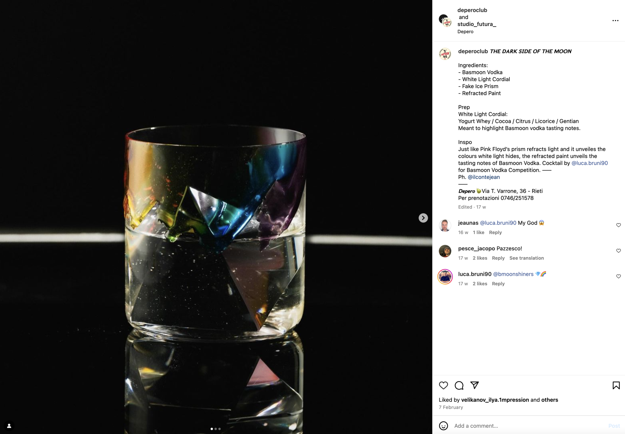 Studio Futura的《月球的黑暗面》鸡尾酒。来源:@studio_futura_“每一口都应该是不同的味道,”Bruni说:蓝色代表佛手柑,靛蓝色代表甘草,黄色代表柑橘。从上方精确投射的灯光在玻璃杯周围投射出脉动的光环,墙上投射出星星和月亮的图像。Pink Floyd的Shine On You Crazy Diamond在背景中播放。