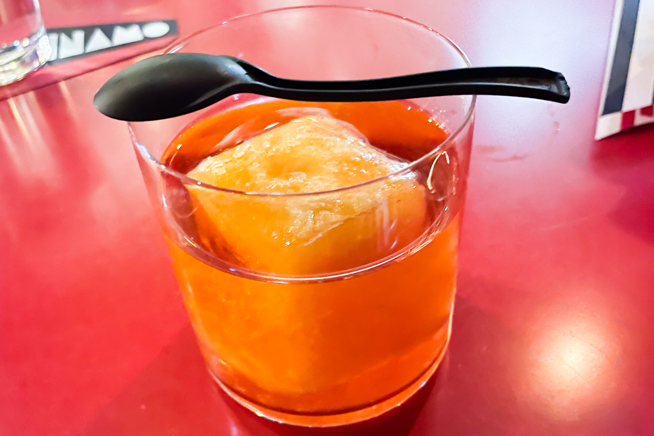 我立刻关注了Negroni部分,并点了Pornstar Negroni,这是意大利特色的混合饮料,模仿了Porn Star Martini,这是由已故的Douglas Ankrah创造的现代经典伏特加饮料,以其百香果和香草味而著称。这个Negroni里没有杜松子酒:香草伏特加、Cocchi Rosa(一种像苦艾酒的香酒)、Biancosarti(一种金色苦甜开胃酒)和“闪光糖浆”一起送来,由一个慢慢融化到饮料中的百香果冰块冷却。
