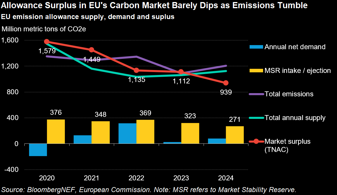 碳排放 | 欧盟排放量的下降使得该地区碳市场中的总配额保持在较高水平,需要额外干预以确保市场保持正常运行。(BloombergNEF)