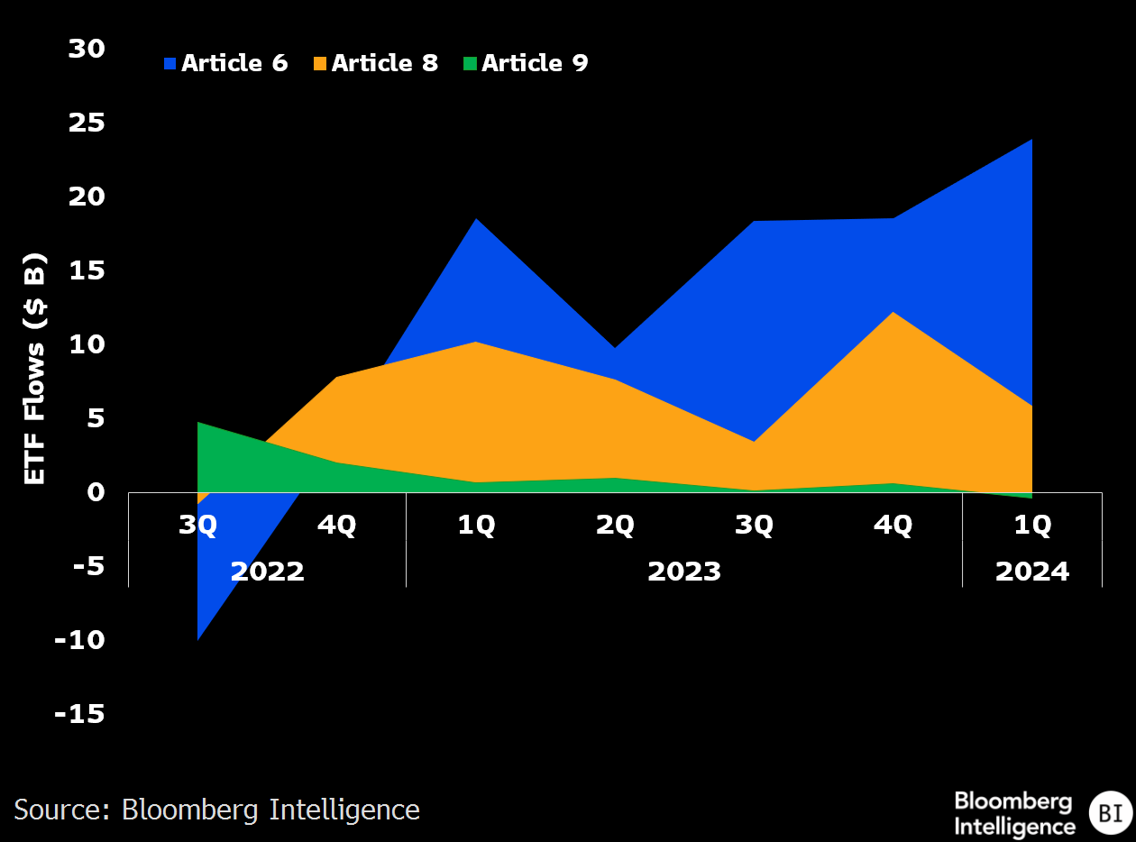 来源:彭博智库ETF | 在欧盟投资制度改革和主要选举不确定性之前,摇摆不定的深绿色和浅绿色ESG ETF流入在2024年仍将面临挑战,而整体ETF市场仍在快速增长。(彭博智库)
