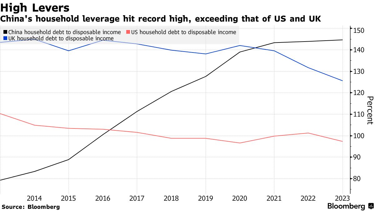 尽管缺乏关于水下抵押贷款和违约的及时数据使问题难以量化,但代理数据表明,刘并不是唯一一位在努力偿还房屋贷款的人。根据彭博编制的数据,2023年底每人可支配收入的家庭债务占比达到了145%,远高于英国的126%和美国的97%。