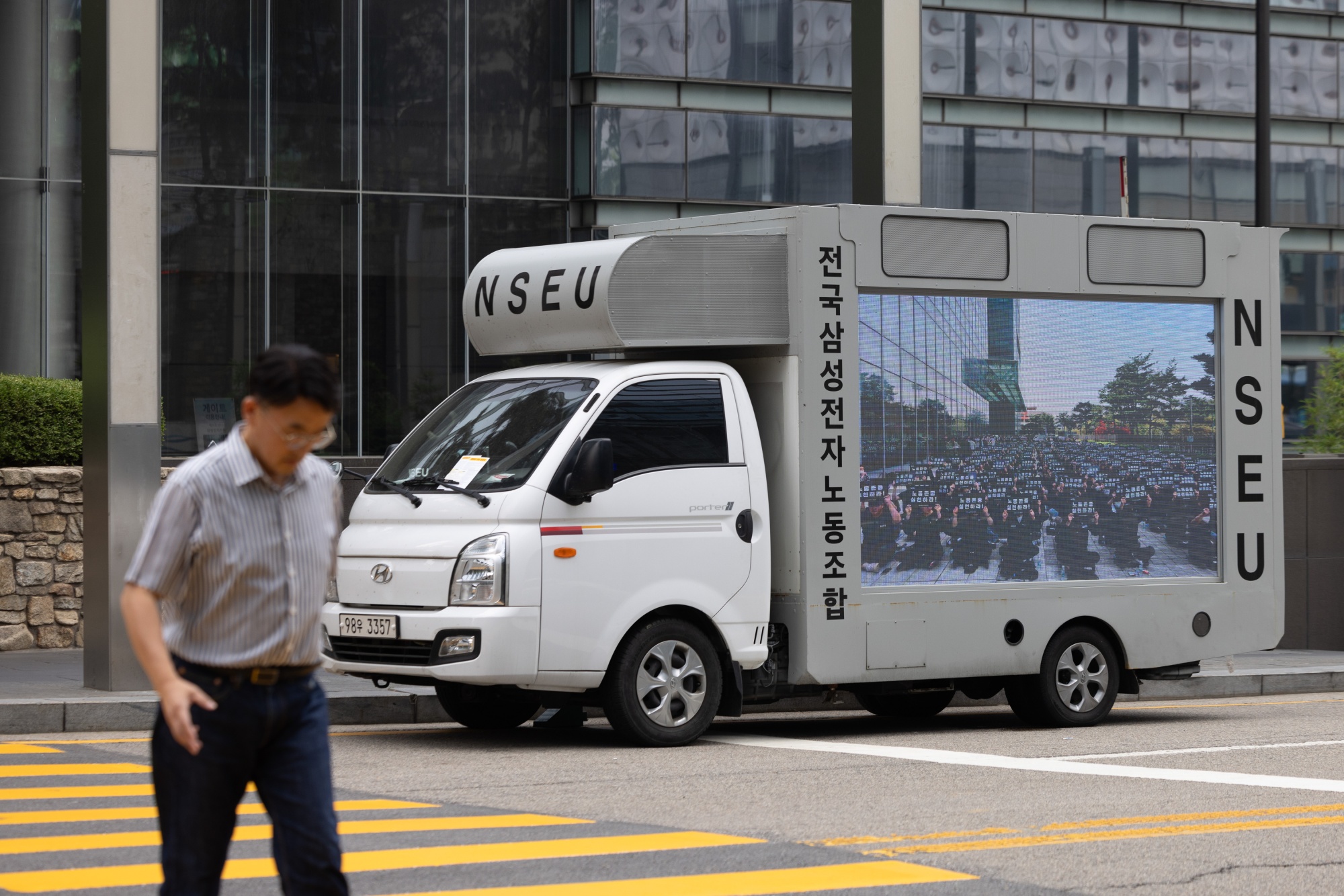 工会领导人周五聚集在首尔三星办公大楼前,其中一人接受当地电视台采访。一辆挂着巨大白色抗议横幅的公共汽车停在现场。横幅上写着工人的呼吁,但人群大多保持沉默。