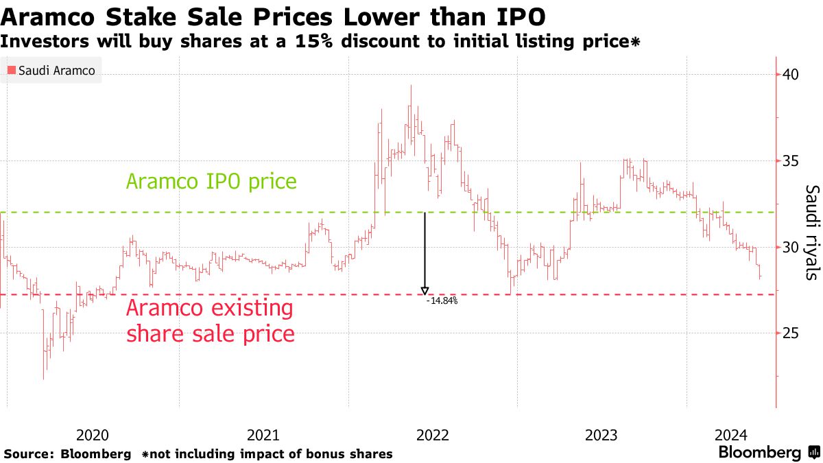 根据一份声明,政府将以每股27.25里亚尔(7.27美元)的价格出售近15.5亿股。这比交易宣布之前该股的最后收盘价低6%,与过去十年类似规模交易的平均折扣率相符。
