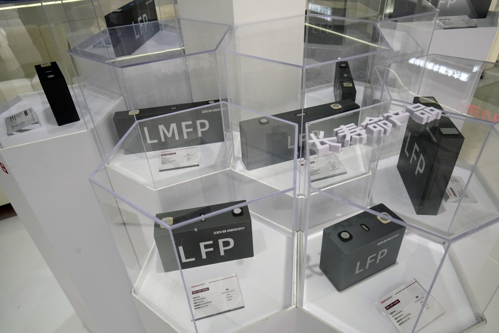 三和达电子有限公司在四月的北京车展上展示锂离子电池。摄影师:神奇来沈/彭博社