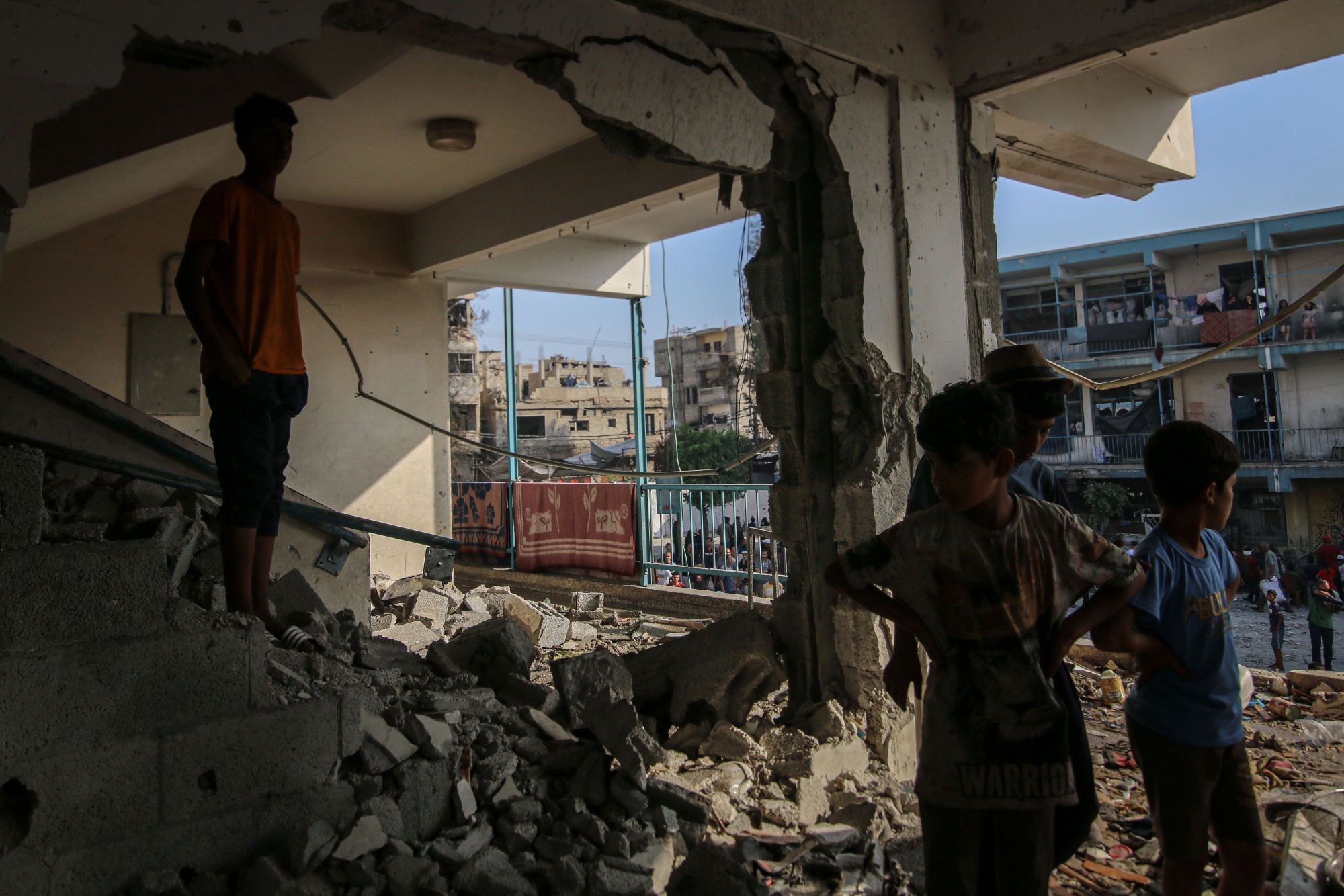 巴勒斯坦人在加沙中部努赛拉特难民营检查一所为被迫害巴勒斯坦人提供庇护的学校遭受的破坏,日期为6月6日。摄影师:艾哈迈德·塞勒姆/彭博社更早报道:拜登试图结束加沙战争,但以色列和哈马斯反击