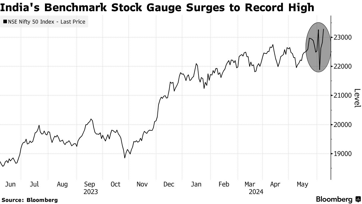 摄影师:Dhiraj Singh/Bloomberg印度股市飙升至新的历史高点,收回了周二意外选举结果引发的创纪录抛售行情,这使得这个世界第五大股市的损失得以弥补。