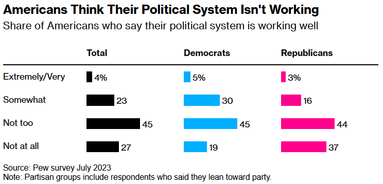 华盛顿皮尤研究中心二月份的报告发现,在22个受调查国家中,认为代议制民主是一种非常好的治理方式的人数自2017年以来下降了一半。