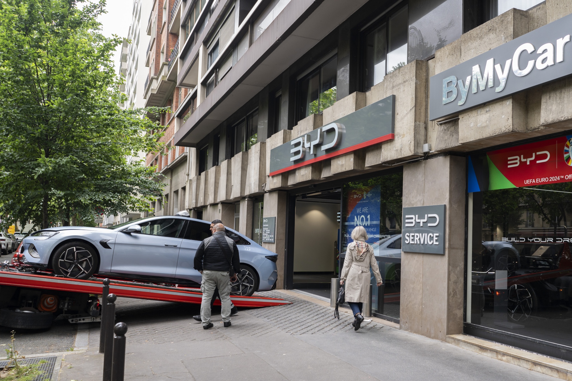 一辆比亚迪电动汽车被送到巴黎的一家比亚迪服务中心。