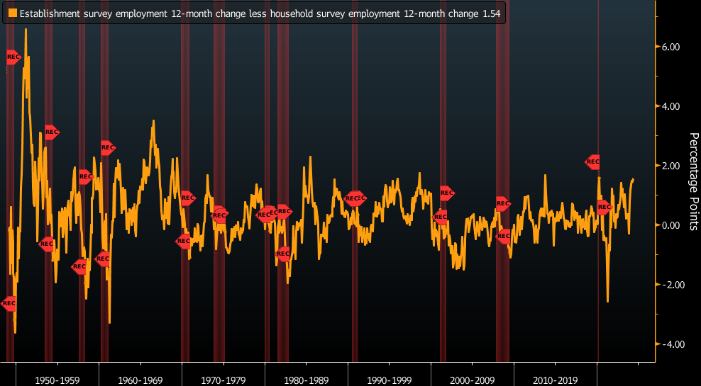 根据企业调查,就业率比去年同期增长了1.8%。根据家庭调查,只增长了0.2%。下面的图表显示,两者之间的差距很少有这么大。