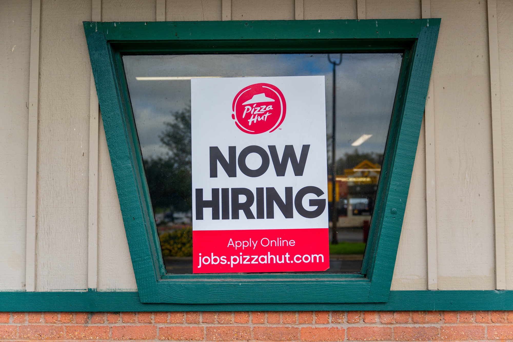一家必胜客餐厅的窗户上展示着“招聘中”的标志。