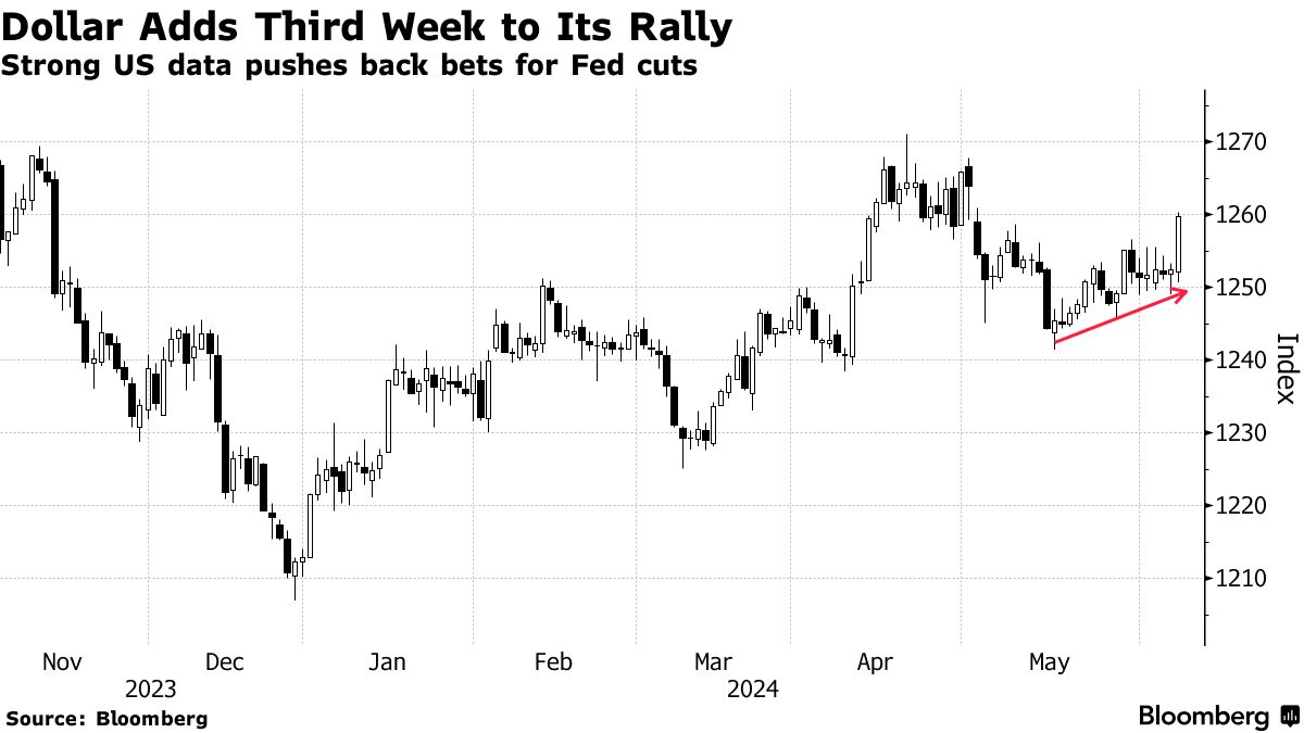 美元强度的彭博指数自2月以来连续获胜的周数最长,因为美国经济的实力粉碎了任何剩余的近期美联储政策转变的希望。