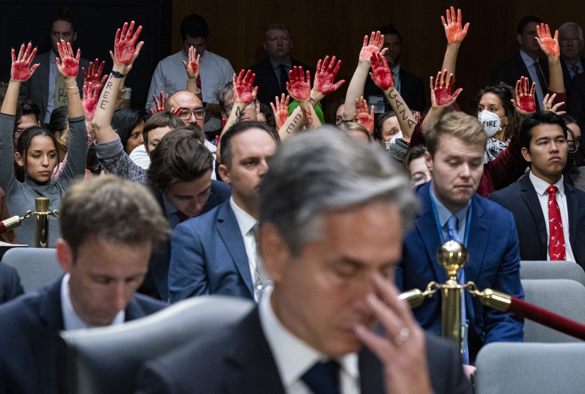 抗议者在十月份参议院拨款委员会听证会上举起手来,安东尼·布林肯身后。摄影师:Al Drago/Bloomberg