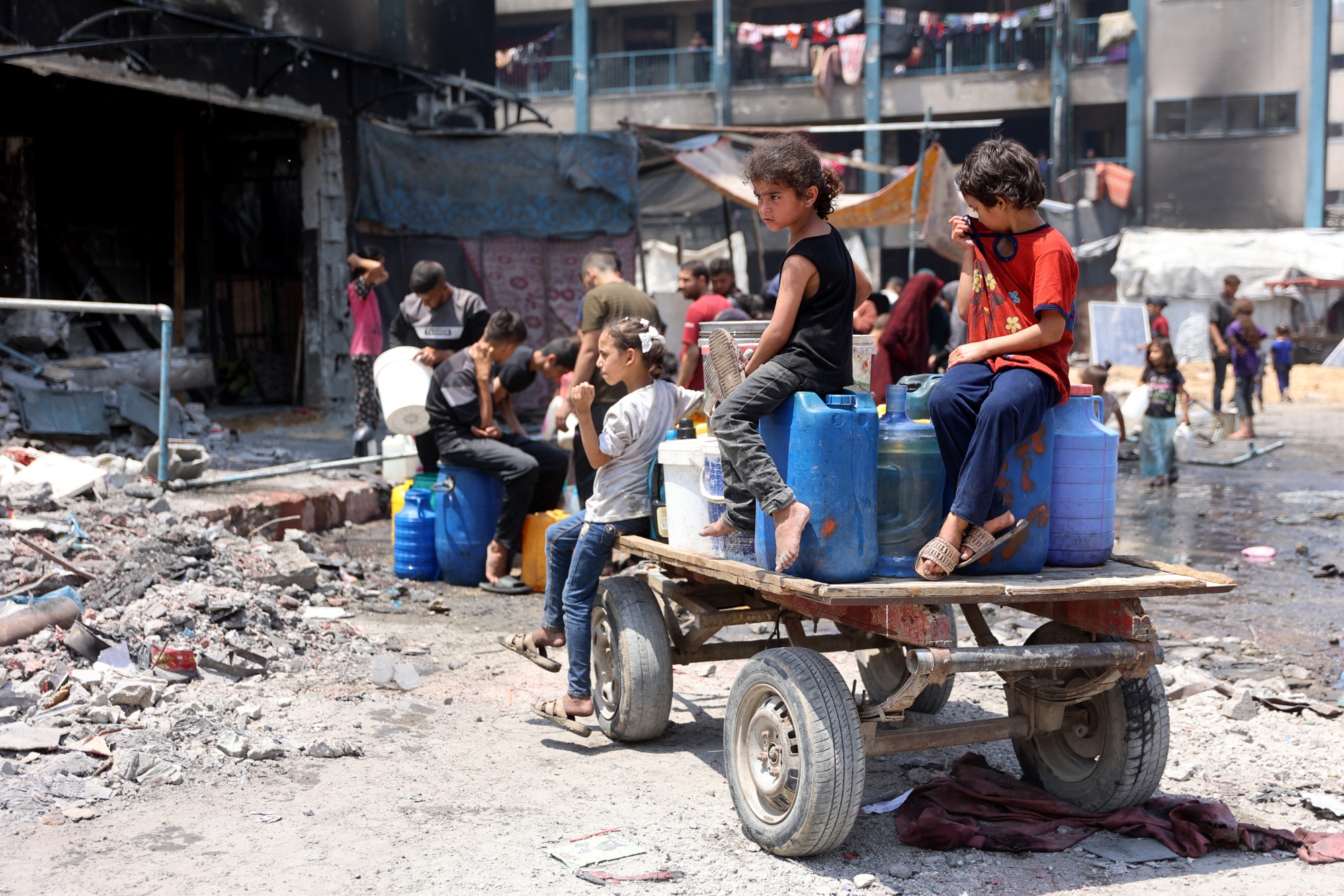 巴勒斯坦儿童坐在部分被摧毁的加利亚难民营学校等待装满水的容器,时间是6月3日。