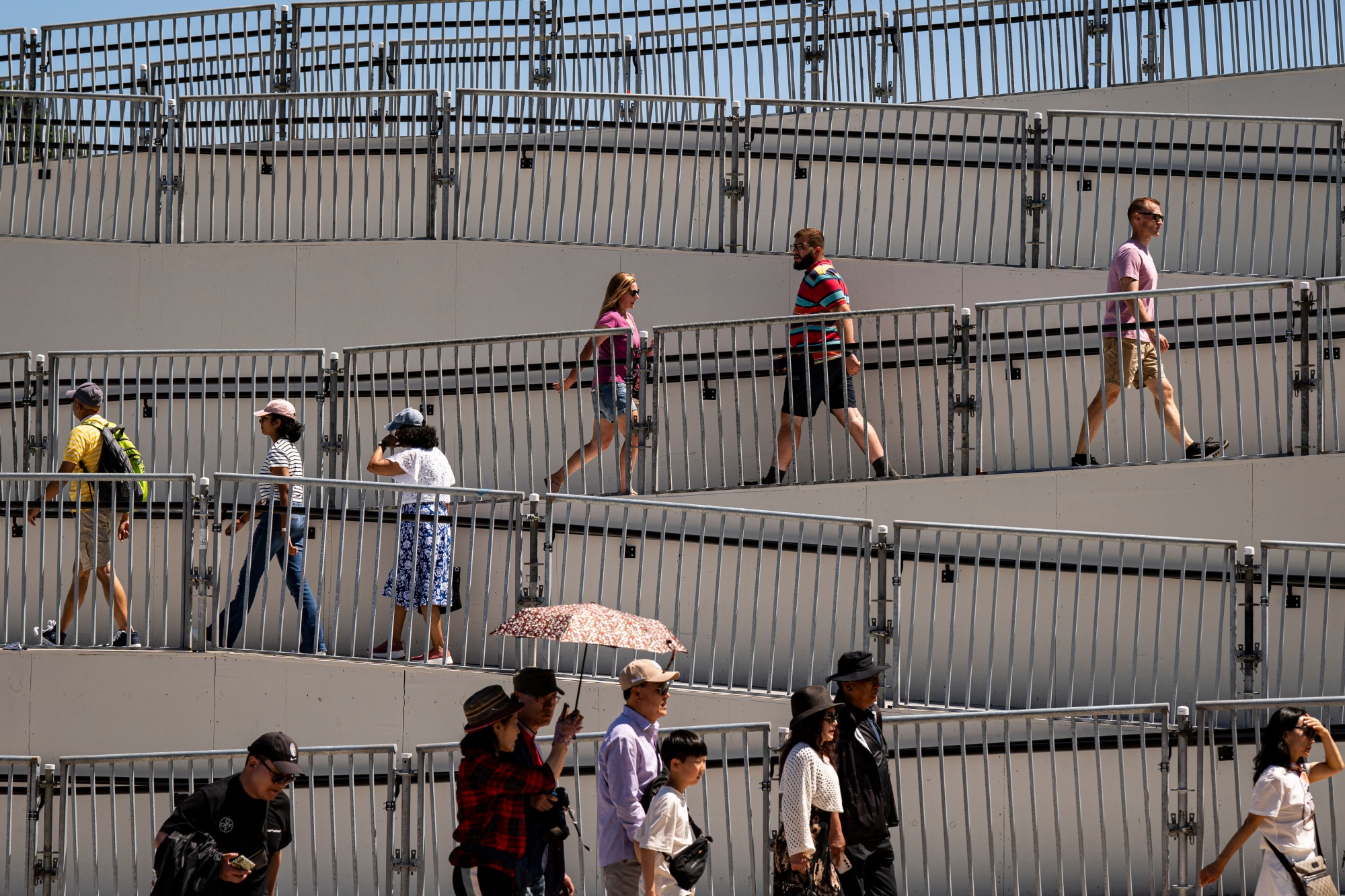 在华盛顿进行翻新工程期间的林肯纪念堂的行人。