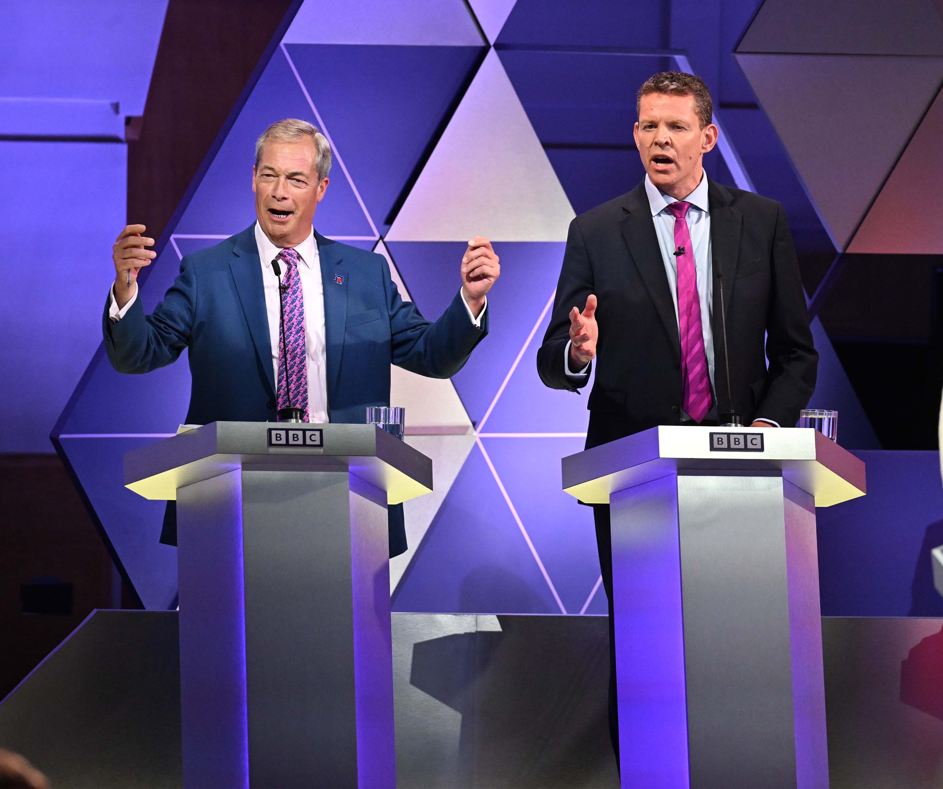 奈杰尔·法拉奇(Nigel Farage)左,与鲁恩·阿普·伊奥尔斯(Rhun ap Iorwerth)在6月7日伦敦的BBC选举辩论中。