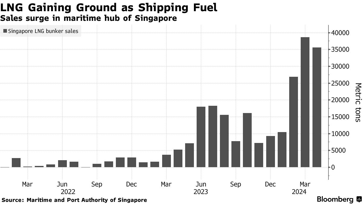 在航运领域也是类似的情况,液化天然气是取代污染燃油之一。新加坡这个海上交通枢纽的船只用液化天然气的销量比一年前增加了10倍。主要替代品