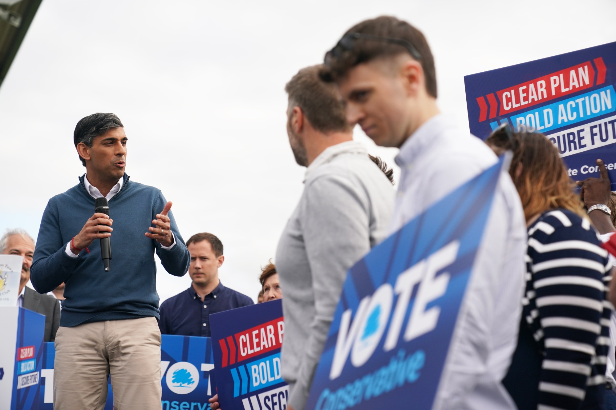 英国首相里什·苏纳克在竞选活动中访问梅尔克舍姆镇足球俱乐部时发表讲话。