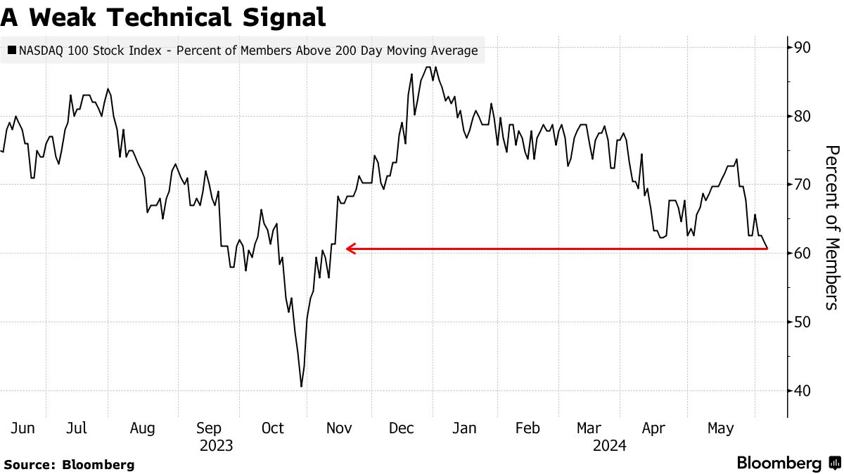 纳斯达克100指数成分股中超过60%的股票高于它们的200日移动平均线,这是自11月以来最少的,也比1月的近90%峰值下降。这一趋势反映了尽管这个以科技为主的指数今年表现不错,但大部分涨幅来自它的主要成分。尽管纳斯达克100今年上涨了13%,但该指数的等权重版本仅上涨了3.5%。