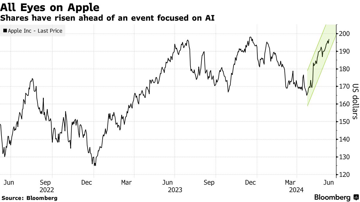 截至最近收盘,股价已经飙升了近20%,回升至3万亿美元市值以上,并距去年创下的收盘纪录仅差1%。尽管部分涨势反映了五月初的一份积极收益 报告,其中苹果宣布了美国历史上最大的股票回购,但对人工智能的改善情绪也是牛市案例的核心。