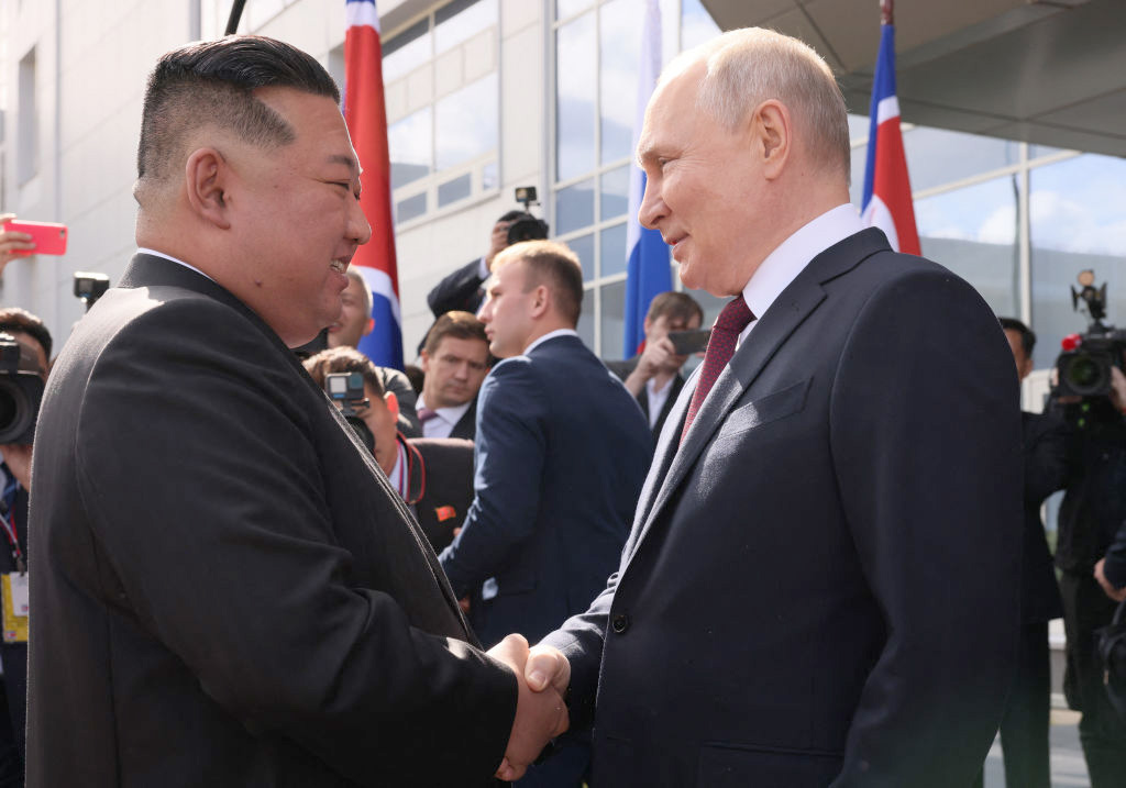 弗拉基米尔·普京在俄罗斯阿穆尔地区的沃斯托奇尼航天发射场与金正恩会面,时间为2023年9月。摄影师:弗拉基米尔·斯米尔诺夫/POOL/AFP/盖蒂图片社普京接受了金正恩在9月份前往俄罗斯参加峰会时邀请访问平壤的邀请。两人在俄罗斯阿穆尔地区的沃斯托奇尼航天发射场会面。
