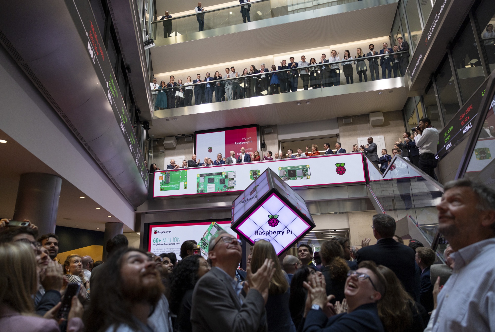 在6月11日伦敦证券交易所为树莓派有限公司的上市首日敲钟仪式上的与会者。