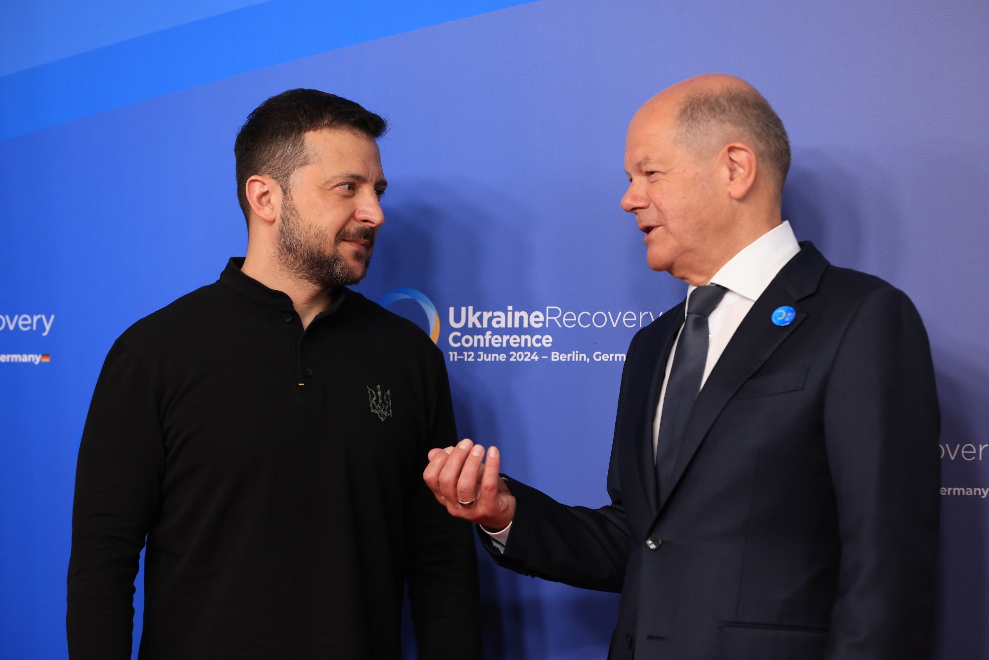奥拉夫·肖尔茨和弗拉基米尔·泽连斯基在6月11日在柏林举行的乌克兰复苏会议上。摄影师:Krisztian Bocsi/Bloomberg