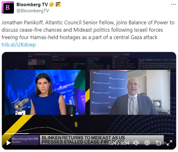 今天在彭博电视台的权力平衡早间版节目中,主持人乔·马修和凯莉·莱因兹采访了大西洋理事会斯考克罗夫特中东安全倡议主任乔纳森·帕尼科夫,讨论了以色列与哈马斯交战中停火的前景。