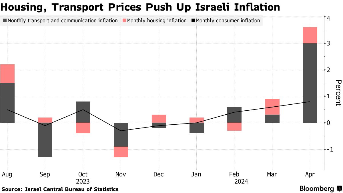 自战争开始以来,前往以色列的国际航空公司数量减少了三分之一,平均每日航班量减少了40%。因此,4月份航空票价是通胀的最大推动因素,上涨了11%。