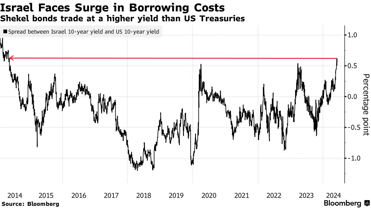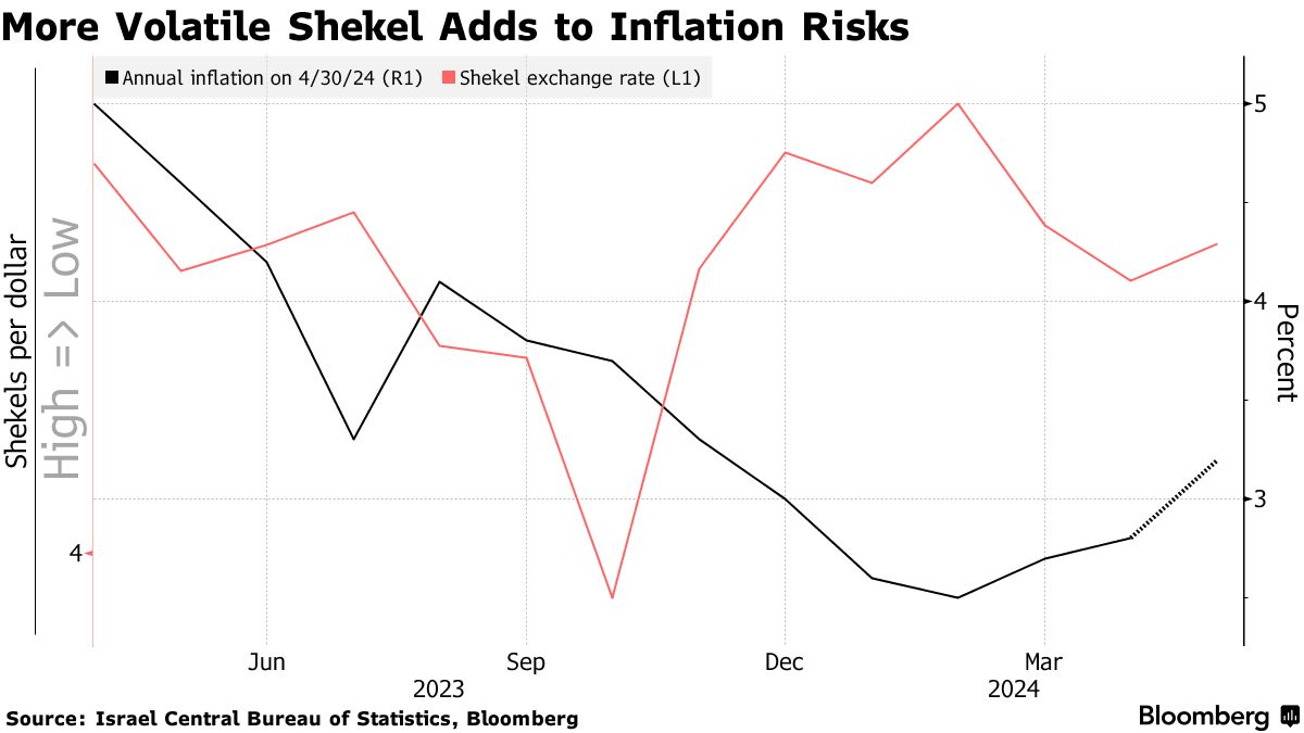 通货膨胀的势头将更难以减缓,因为失业率已接近疫情前的低点,2024年前两个月工资增长近8%。更高的税收和公用事业成本,再加上扩张的财政政策和更加波动的谢克尔,也给价格带来了压力。