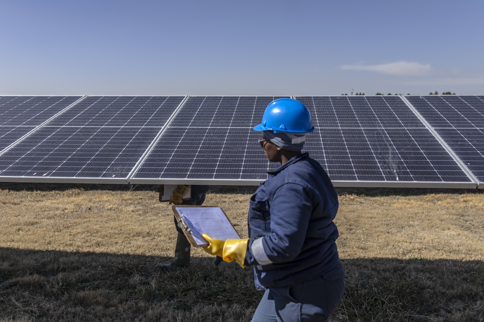 一名工人在南非埃万德尔的太阳能发电厂检查光伏板。摄影师:Guillem Sartorio/Bloomberg