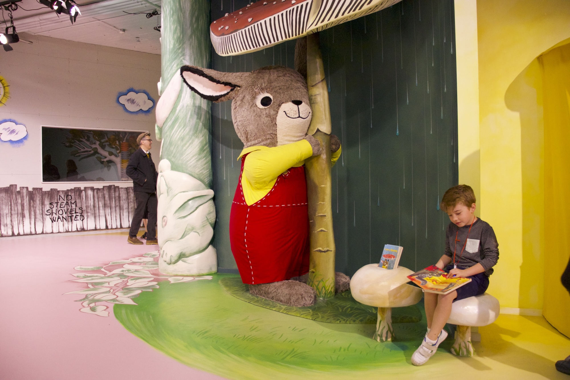 在这个由艺术家、联合创始人和前书商皮特·考德因和黛布·佩蒂德于2015年首次构想的兔子洞世界中,晚安月亮通向约翰·斯蒂普托的城市漫步上城,再通向托米·德·保拉的意大利村庄故事斯特雷加·诺娜,如此循环,穿越一个又一个心爱的故事书中的建筑环境。当他们穿过这家由建筑师Multistudio从一家以前的仓库雕刻而成的博物馆的楼层时,孩子们在哈莱姆区摇摆,或者在一个戴帽子的树下读书,或者和萨尔的母亲一起烤馅饼,或者检查克拉森的熊是否真的吃了那只兔子。