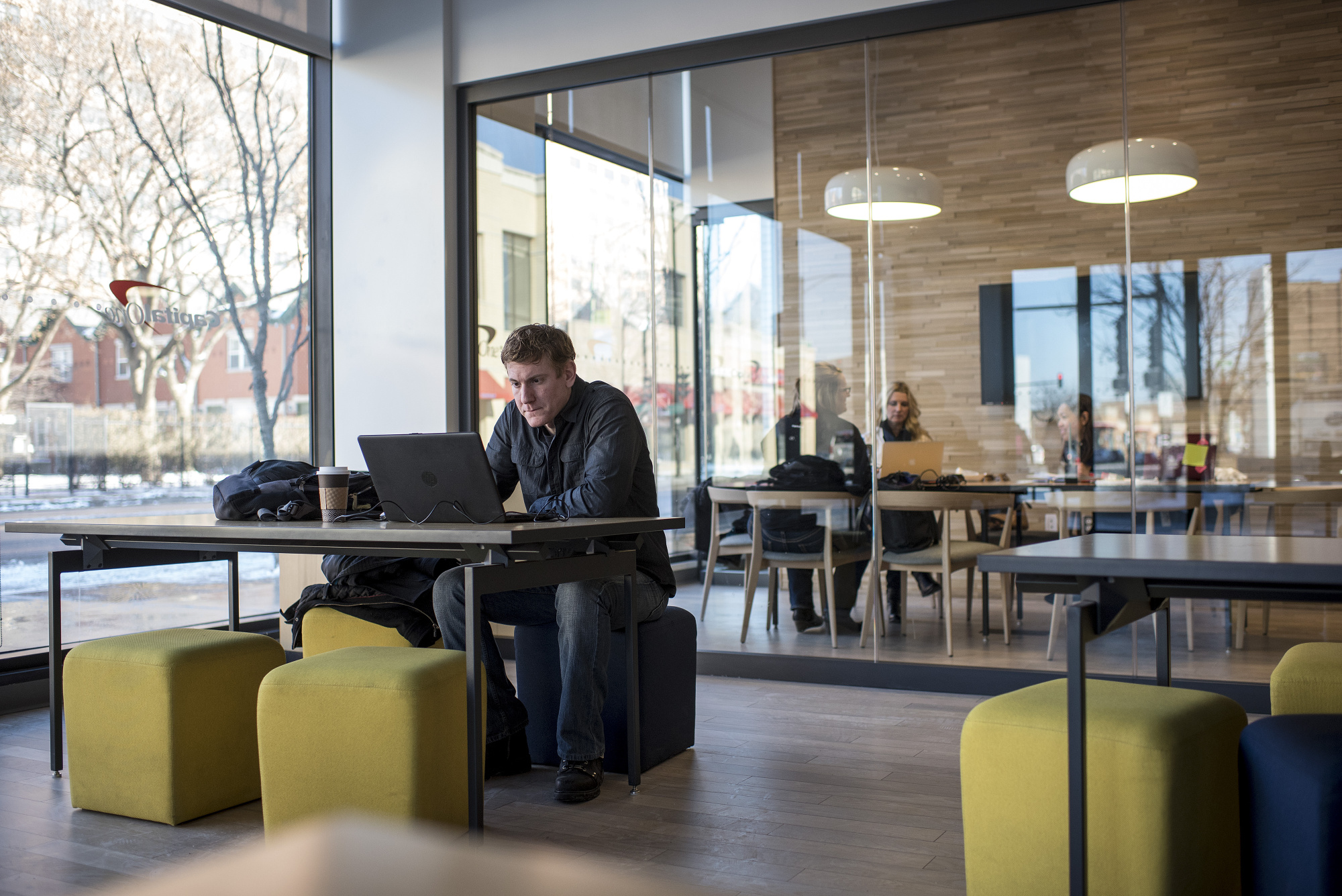 一位顾客在芝加哥伊利诺伊州的Capital One Cafe使用笔记本电脑。