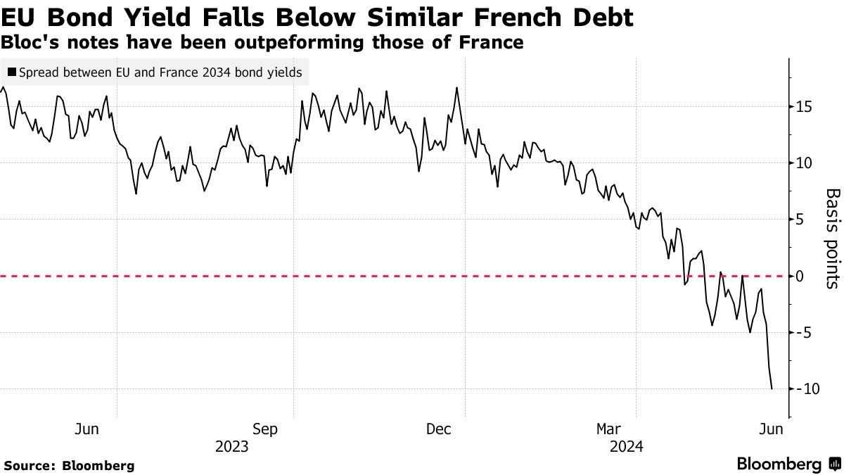 对新欧盟债券的需求昨天未能达到最近交易的水平,因为法国的政治动荡影响了投资者对该地区资产的兴趣。这次销售吸引了375亿欧元的订单,用于15年期的60亿欧元债务发行,远低于一年多前同期销售的635亿欧元订单簿。“可以说,市场条件并不是最容易的,尤其是在法国发生的一切情况下,”一位分析师表示。