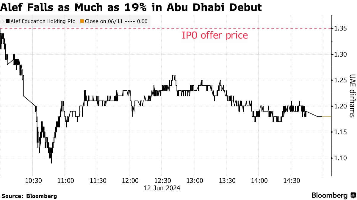 2024年阿布扎比的首次公开上市跟随了该酋长国三年来的繁忙。自2021年初以来,有14家公司进行了首次公开募股,这些公司的股价在首个交易日平均上涨了约31%。根据彭博社编制的数据,这使Alef Education的首次亮相远低于平均水平,并标志着自那一年以来的最差表现。