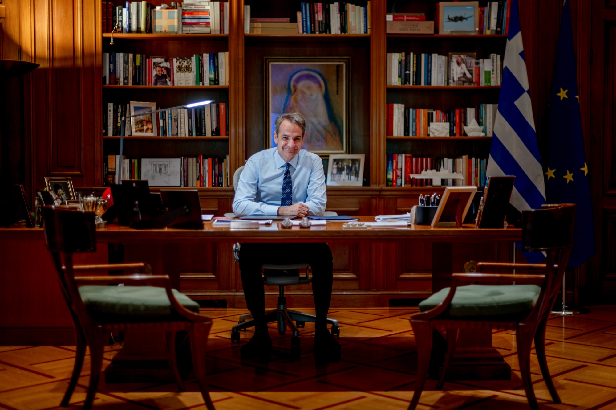 基里亚科斯·米佐塔基斯在雅典办公室,6月12日。摄影师:希拉里·斯威夫特/彭博社
