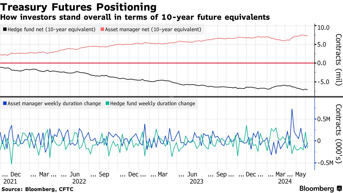 在截至6月4日的CFTC数据显示,资产管理公司连续第二周削减看涨国债期货赌注,相当于约40,000份10年期国债期货。在此之前,资产管理公司从4月16日至5月21日连续数周增加多头仓位。另一方面,对冲基金增加了约168,000份10年期国债期货的净空头寸,将总体净空头寸推高至700万份合约。