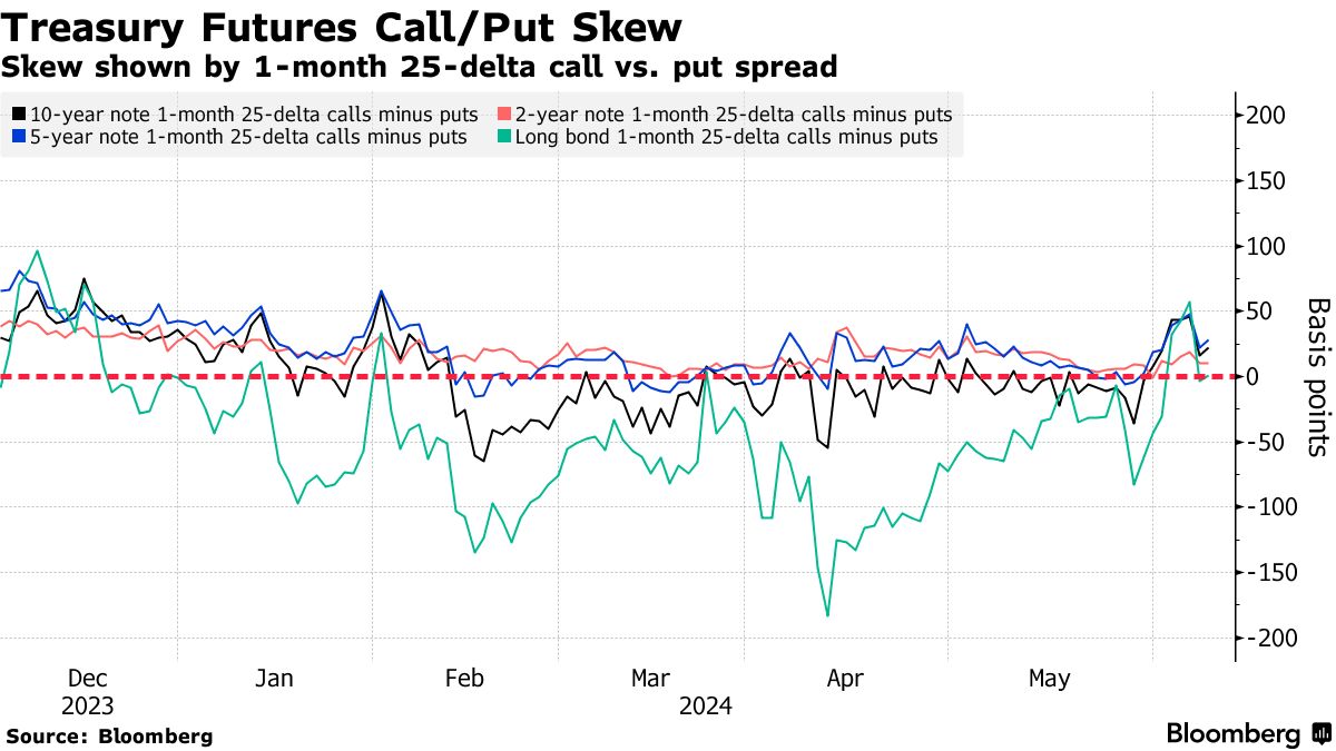 在债券市场反弹成本自2月以来最高一周后,期权偏斜再次接近中性立场,进一步表明投资者正在摆脱最近的看涨情绪。然而,最近10年期期权的交易流向包括对更低价格的上行保护的持续需求。周一的交易中,熟悉的7月10年期111.00看涨期权以5个点的水平买入,用于新的风险,而之前更大规模的交易是以19个点。该行权的未平仓量已上升至10万份期权,目标是将10年期收益率下降到大约4.18%。