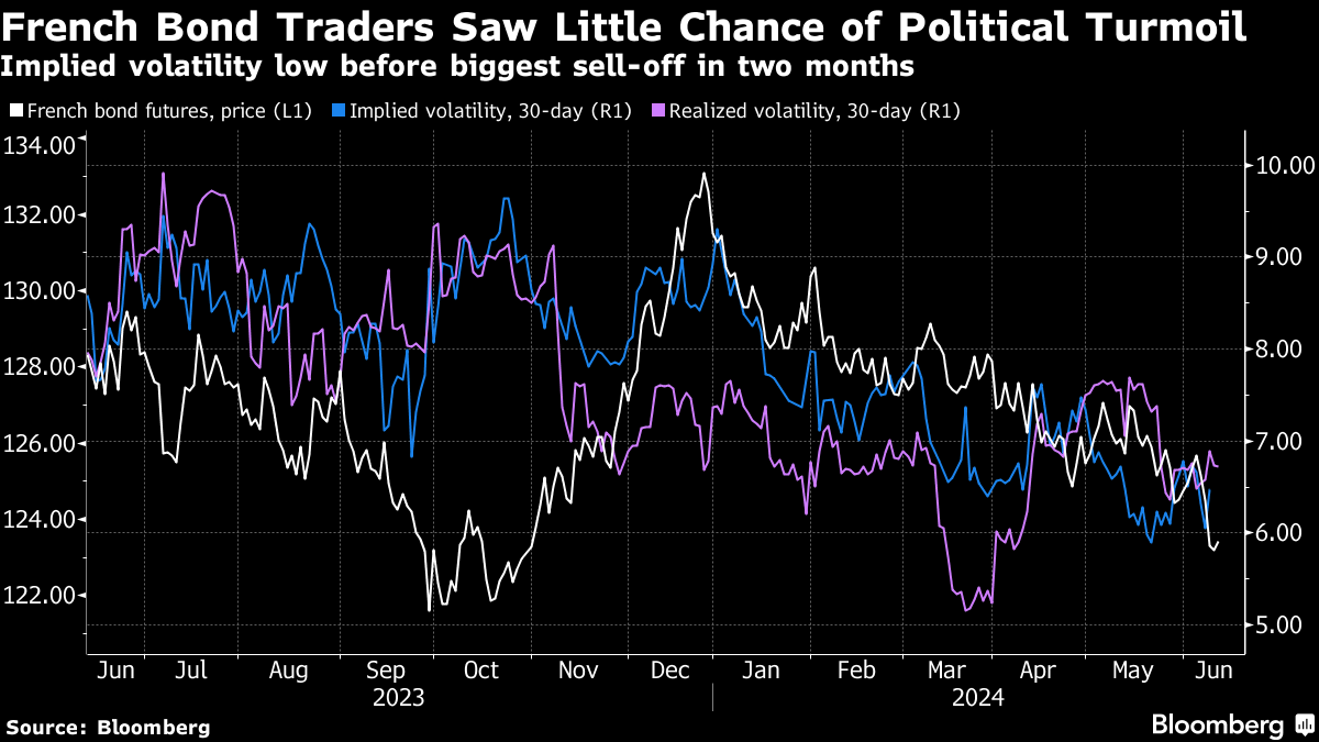本周,欧洲债券交易商因未能预料到周末地区议会选举前的政治动荡而付出代价。对于国家政府党派在选举中表现惨淡的后果导致法国总统马克龙宣布举行紧急选举。这进一步刺激了该国基准债券期货的最大两个月内的最大抛售,将前期合约价格推至2023年9月至10月全球债券崩盘期间的水平。