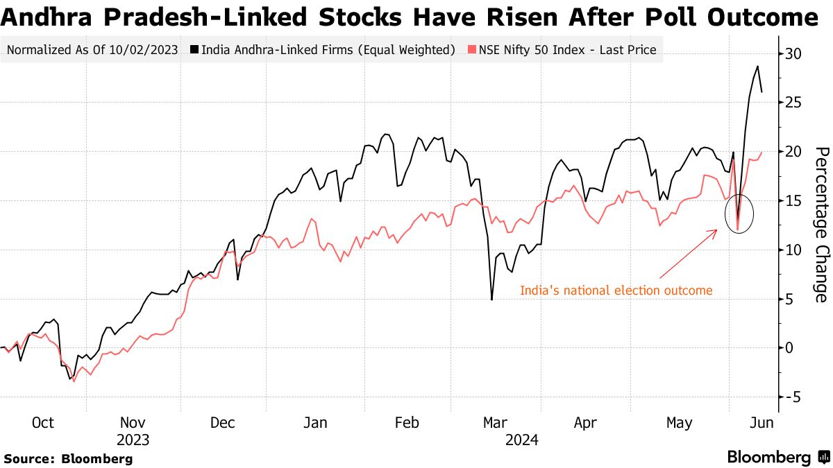 摄影师:普拉卡什·辛格/彭博社印度南部安得拉邦的一些公司本月在该地区的一位政治家支持印度总理纳伦德拉·莫迪组建政府后大幅上涨。