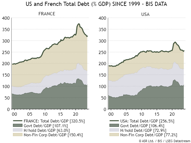 请记住,爱尔兰、葡萄牙和西班牙等国在十多年前都卷入了欧元区主权债务危机。如果法国的状况看起来比它们更为严峻,那就令人担忧。伦敦绝对策略研究公司的伊恩·哈内特进一步指出,自全球金融危机以来,法国一直在以其他发达国家所未见的方式从未来借钱。众所周知,美国进行了比欧元区任何国家都更为激进的财政扩张;而法国企业债务占国内生产总值比例甚至比美国还要大: