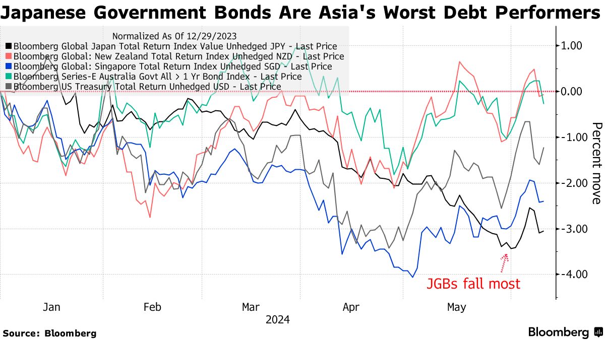 根据彭博全球回报指数的数据,今年JGBs已经下跌约3%,超过新加坡成为该地区跌幅最大的债券,与此形成鲜明对比的是,自6月初以来,澳大利亚和新西兰政府债券的回报率已经转为正值,部分原因是人们认为这两国央行的政策指导明确。