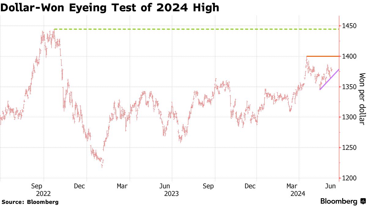 “如果美联储暗示今年和明年减少降息,韩元本周可能会跌破每美元1400的关口,”KB国民银行的经济学家文政休表示。他补充说,韩元已经跌破每美元1350,从技术上讲可能会进一步贬值至每美元1450。
