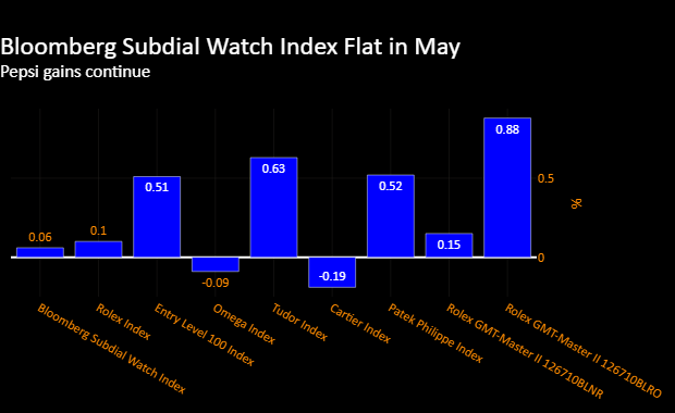 彭博Subdial手表指数追踪二级市场上价值最高的50种交易量最大的手表型号的价格,一年内下跌了8.7%。该指数在五月份基本持平。