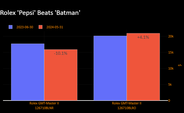 根据来自Subdial的数据,一款最新版本的劳力士GMT Master II手表,带有红色和蓝色陶瓷表圈,昵称为‘百事’,过去一年上涨了4.1%,达到约21,000美元。总部位于英国的手表交易平台Subdial。与此同时,被称为‘蝙蝠侠’的手表——本质上是相同的手表,但表圈为黑色和蓝色——价格下跌了10.1%,降至约16,000美元。