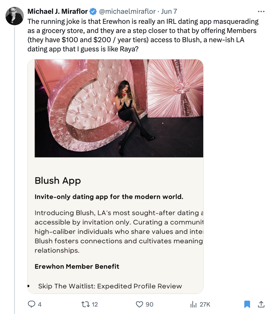 “男孩清醒” 趋势 到处都是。年轻女性放弃他们的 关系状态 来探索其他追求 — 书籍, 烘焙,任何事情 除了 男孩 — 而像 Hinge 和 Tinder 这样的约会应用程序 陷入困境 在它们的缺席中。即使没有发誓远离异性的女性也不再使用旧的应用程序来满足她们的梦想 啮齿动物男人。她们在 Wingman 上,这让你的朋友和家人充当媒人。或者她们在 Thursday,这个应用程序(你猜对了!)只在星期四工作。或者她们收到了邀请去 Blush,这是洛杉矶 Erewhon 顾客的约会应用程序: