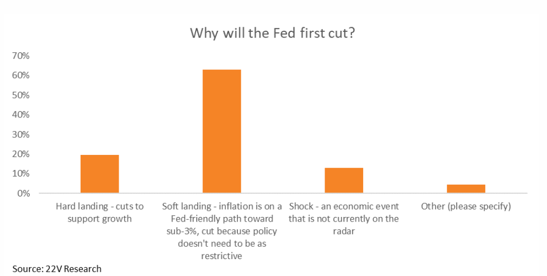 杰罗姆·鲍威尔。摄影师:阿尔·德拉戈/彭博“63%的投资者认为美联储将首先降息是因为经济软着陆,通胀正朝着低于3%的美联储友好路径发展,因此将会降息,因为政策不需要那么严厉,”22V的丹尼斯·德布舍尔说。