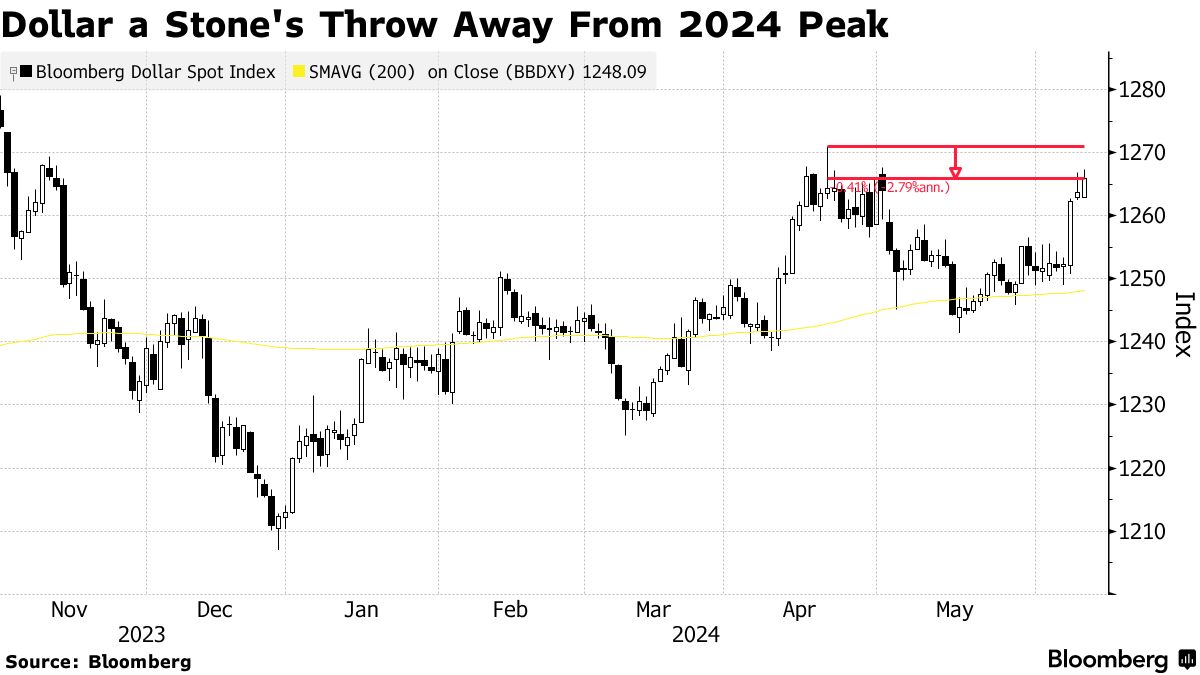 彭博美元现货指数上涨了0.2%,周四收于1,267.71,自11月初以来的收盘基准最高点。虽然该基准仍然低于2024年的最高日内峰值 —— 当指数在4月19日达到1,271.06 —— 但这表明动力仍然支持美元。