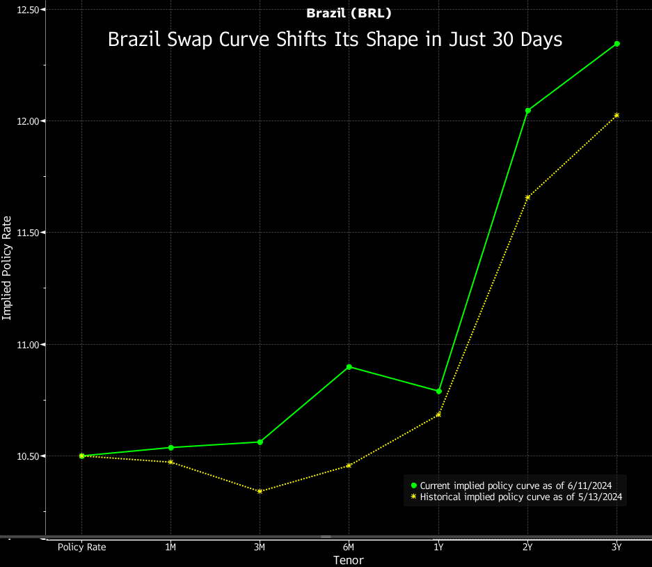 巴西掉期在短短几天内发生了严重变化。到2025年1月到期的合同中,最短期限之一,在五个交易日内飙升了30个基点。为了对比,墨西哥的一到六个月TIIE掉期仅自意外的选举结果扰乱市场以来上涨了12个基点。